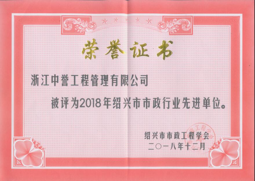 经绍兴市市政行业协会秘书处初审和评审委员会评定:我公司被评为“2018年绍兴市市政行业先进单位”。