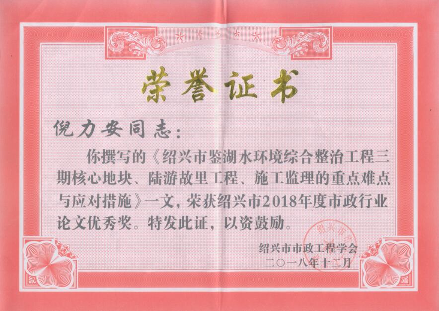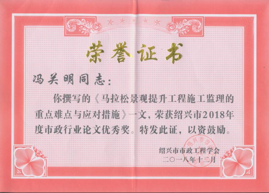总监冯关明、倪力安同志撰写的论文荣获绍兴市2018年度市政行为论文优秀奖。